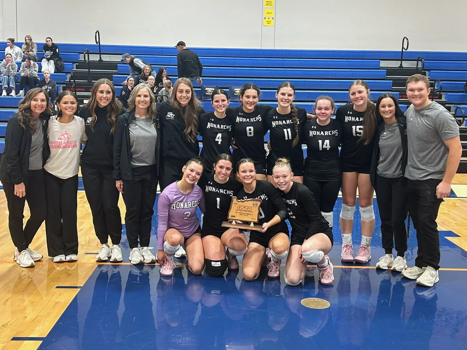 The No. 4-seed Monarchs (25-4) beat the No. 3 Tigers (25-7) in four set. Scores were 25-15, 25-18, 22-25, 25-17.